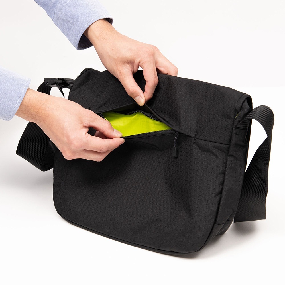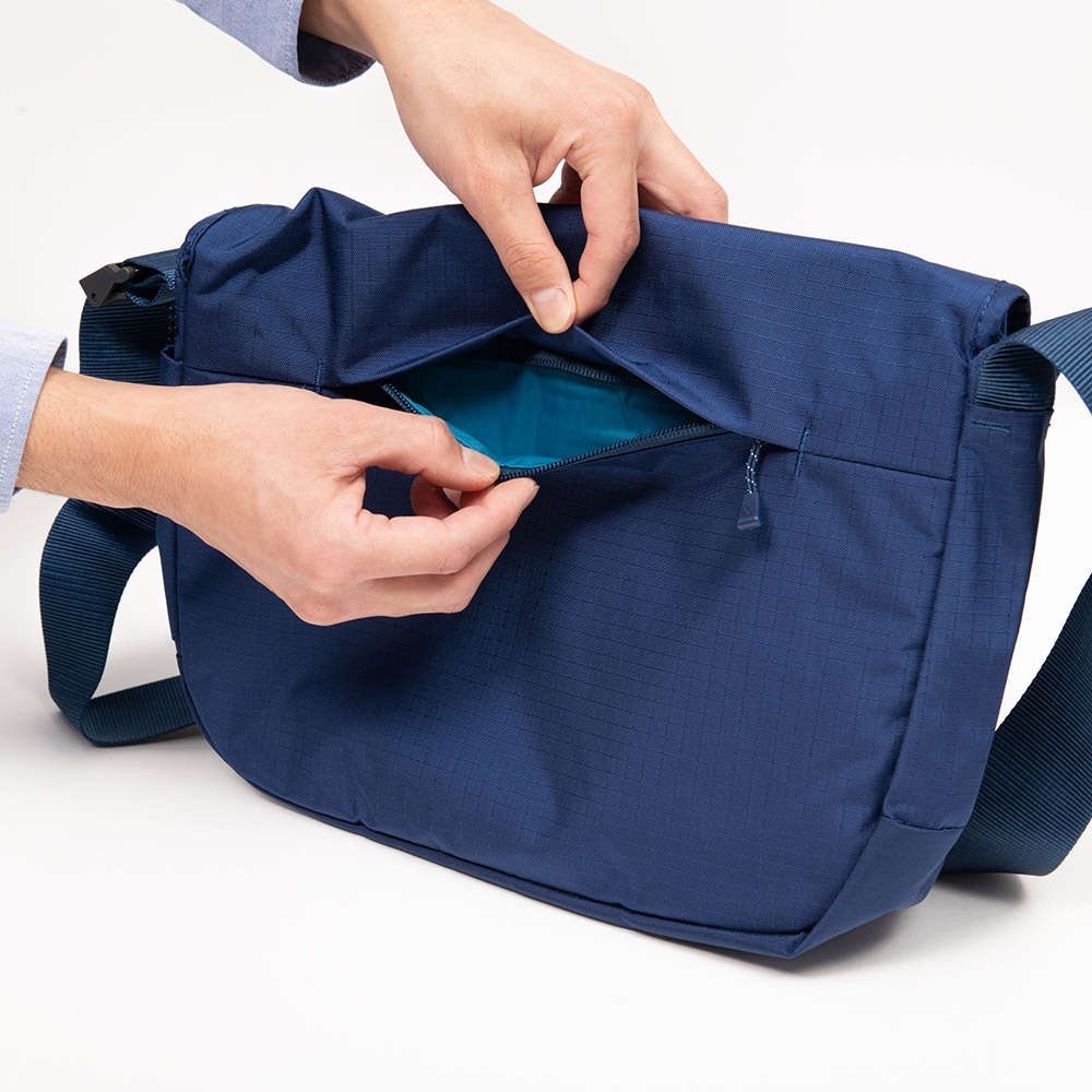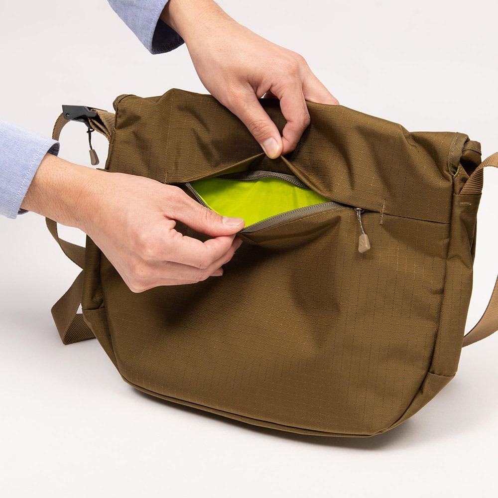 從日常到旅行都可以使用的簡約設計單肩包,結構簡單,有一個大翻蓋。