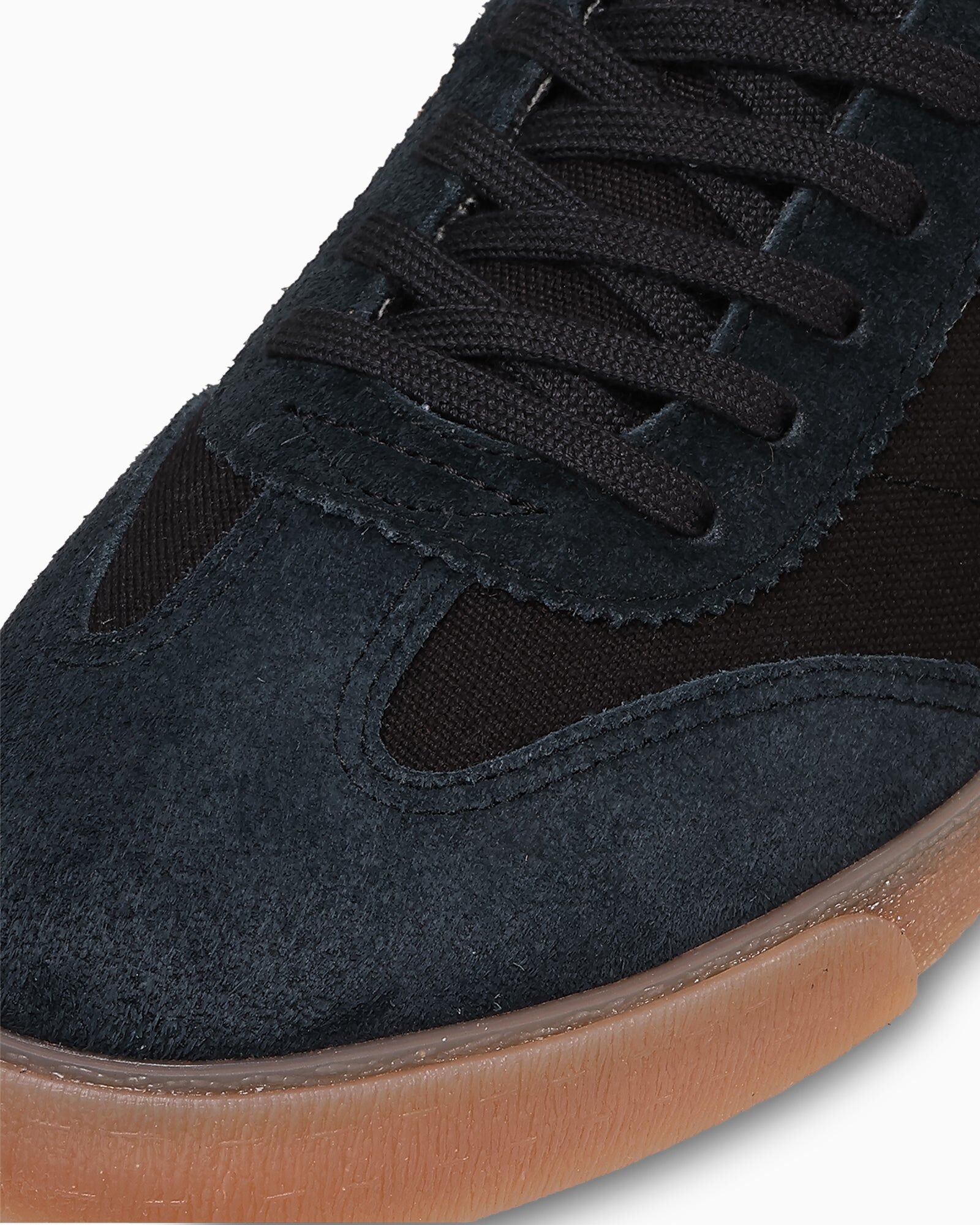 採用帆布材質鞋面,並於鞋頭與後跟加入麂皮設計,提升整體耐用性。