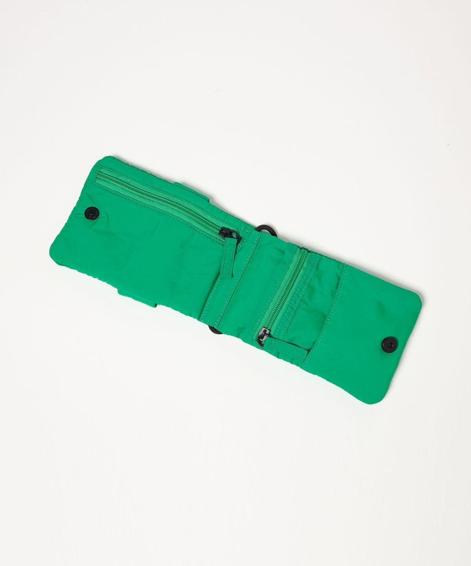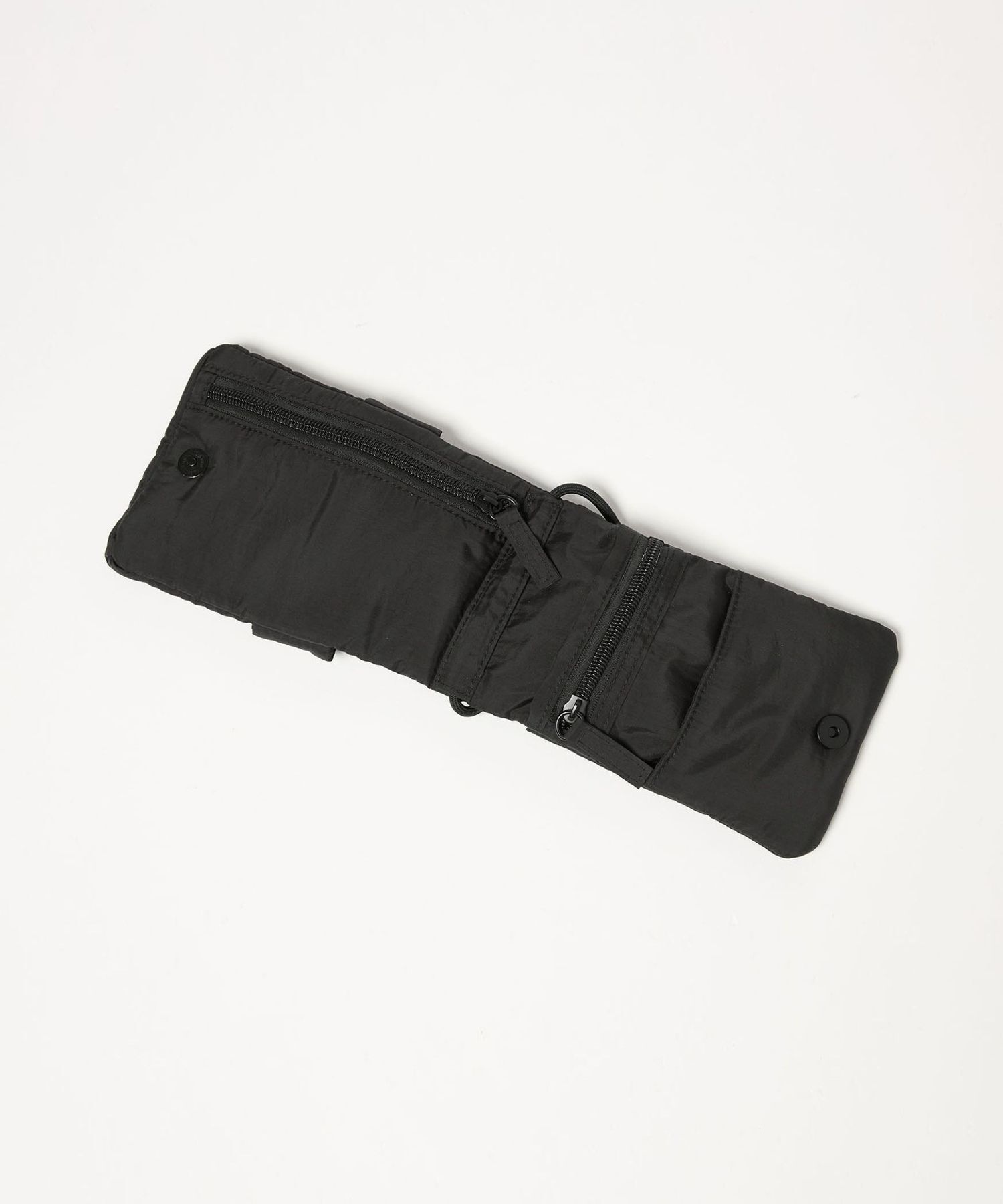 包內一側配有可直向放入手機的翻蓋口袋與拉鍊口袋;另一側則為整面拉鍊口袋設計,大小可放入卡夾等隨身小物。