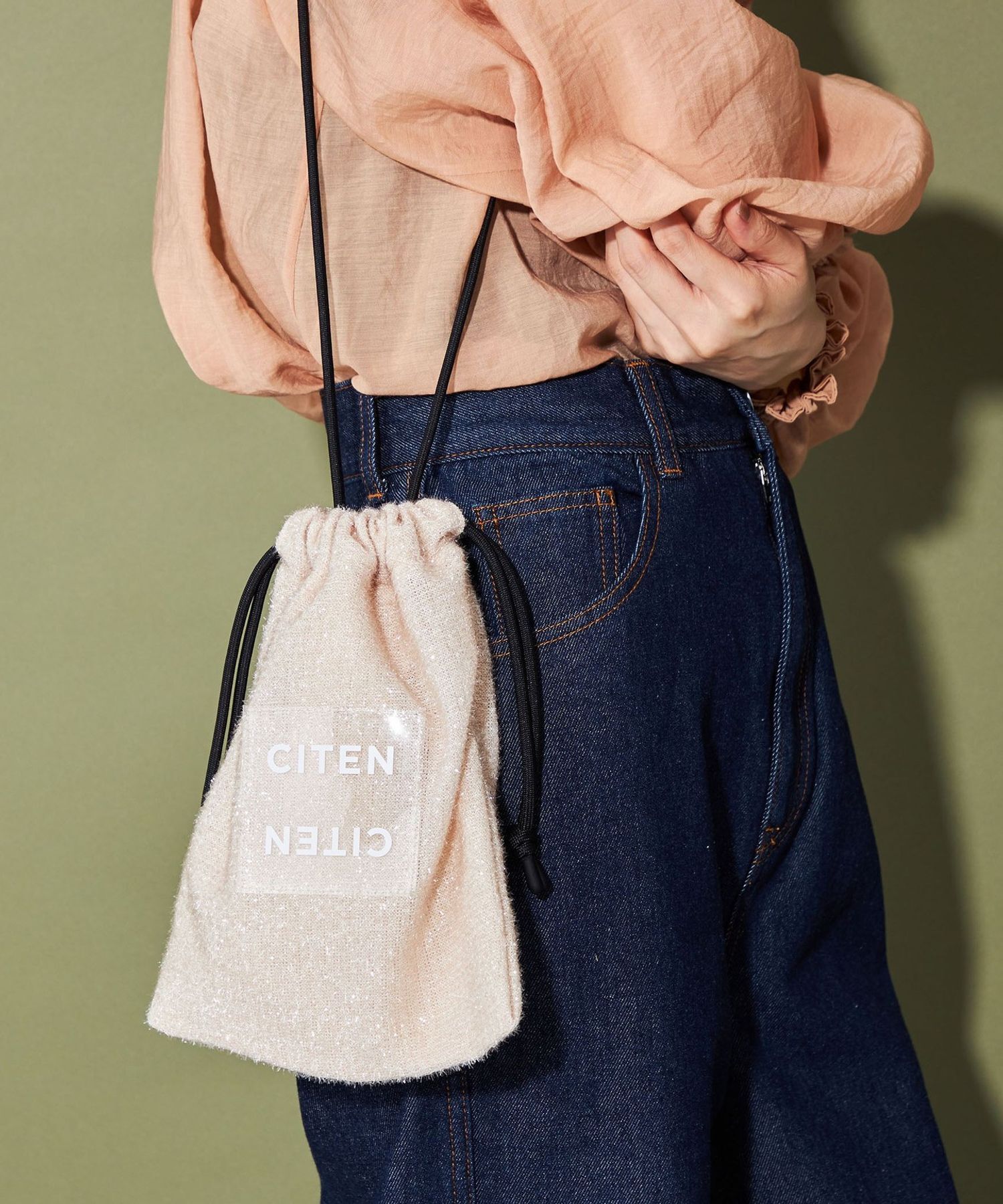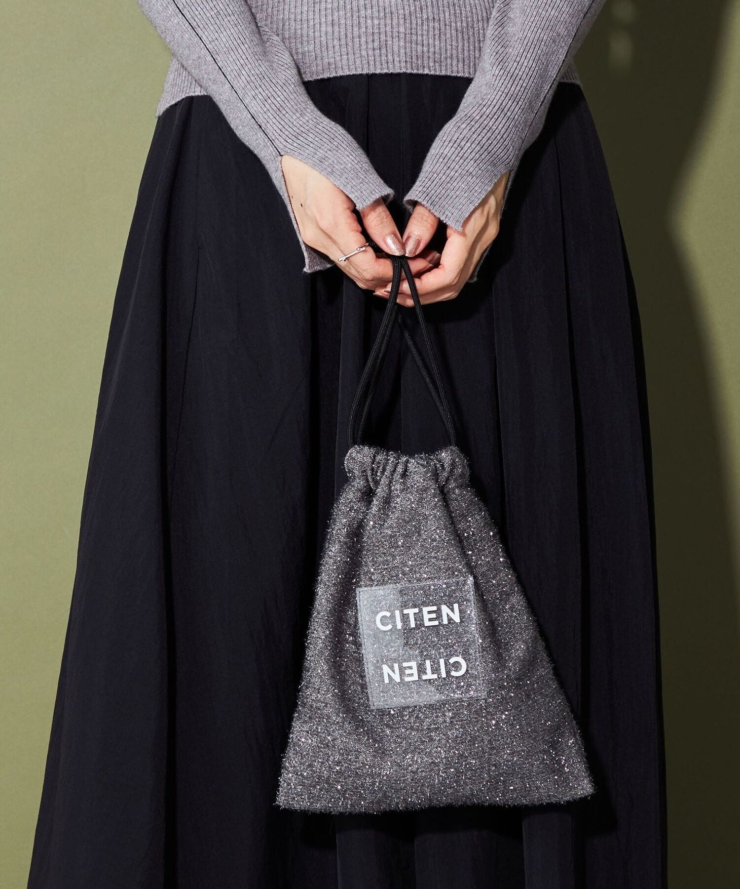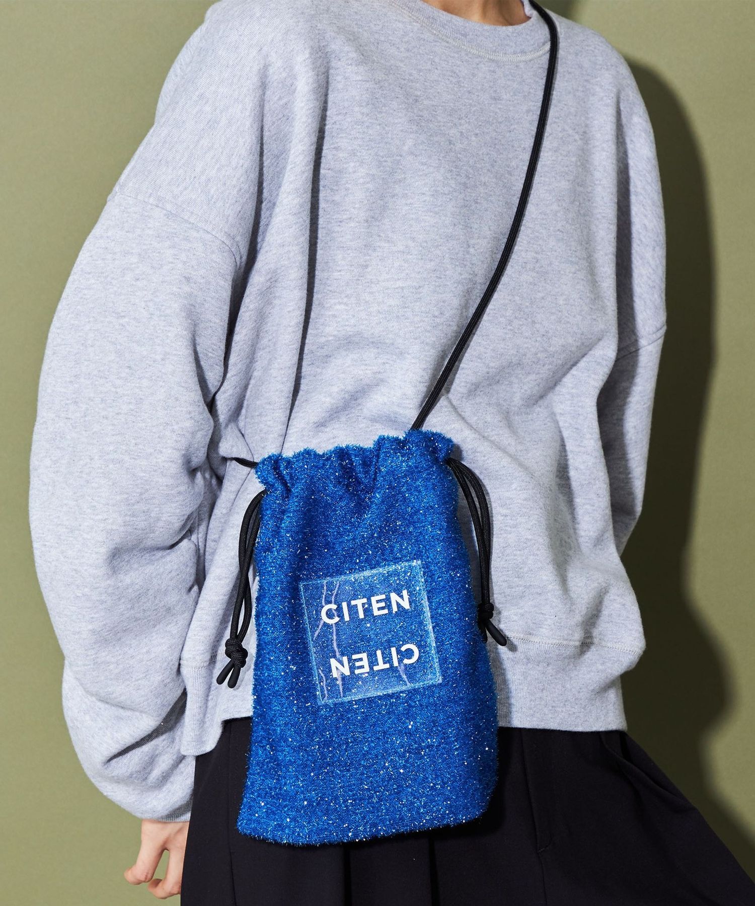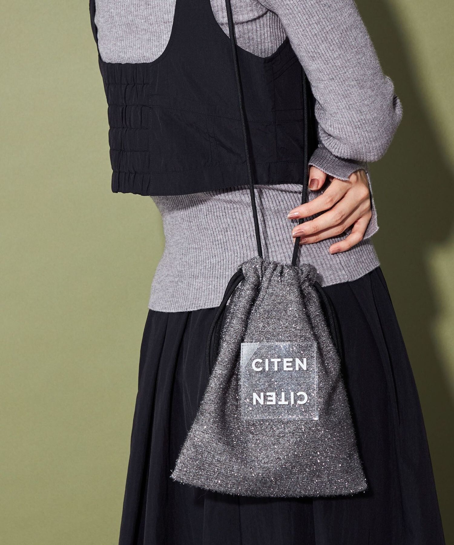 CITEN 經典的束口型肩背包,以略帶挺度的閃亮材質製作,呈現出引人注目的存在感。