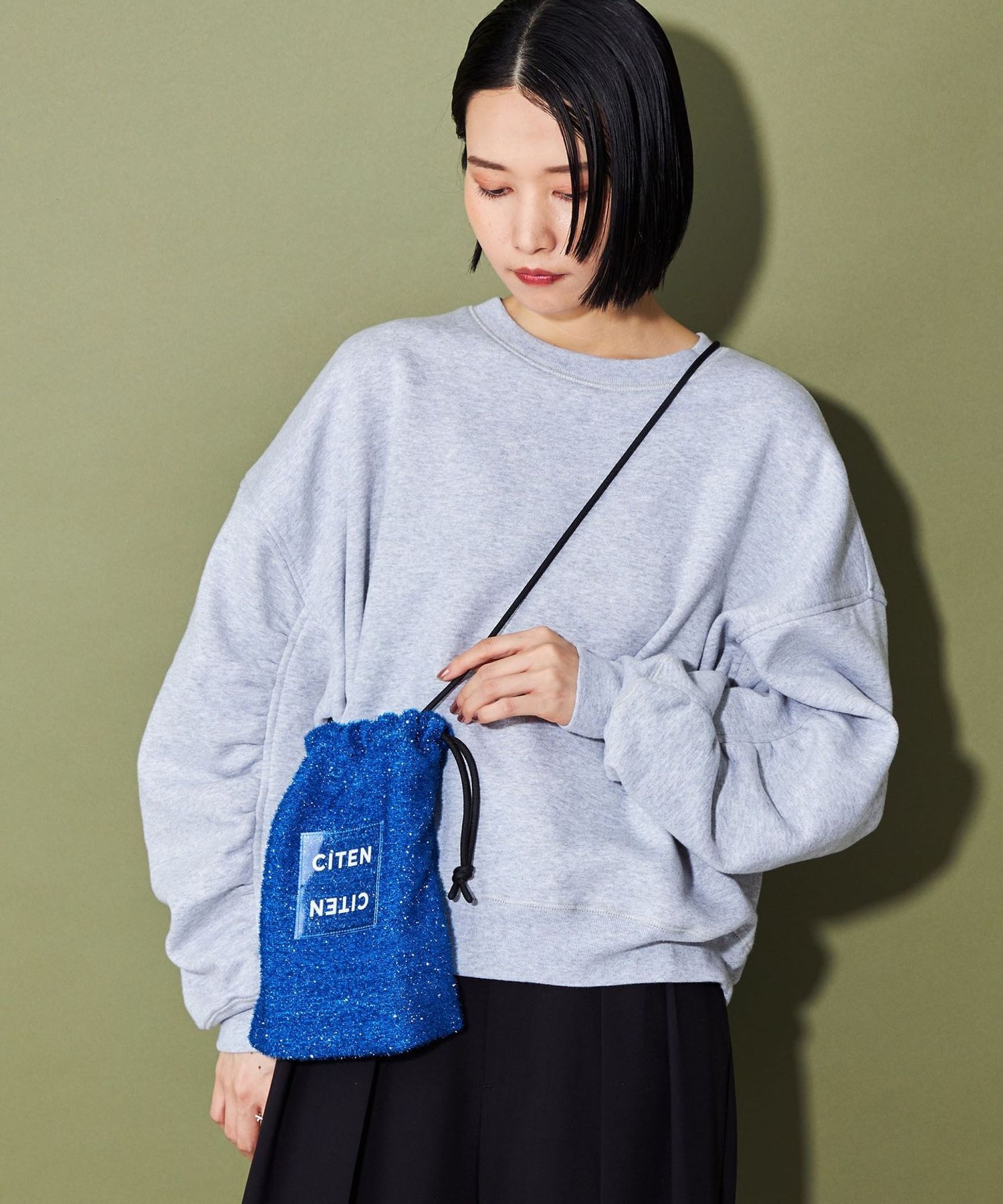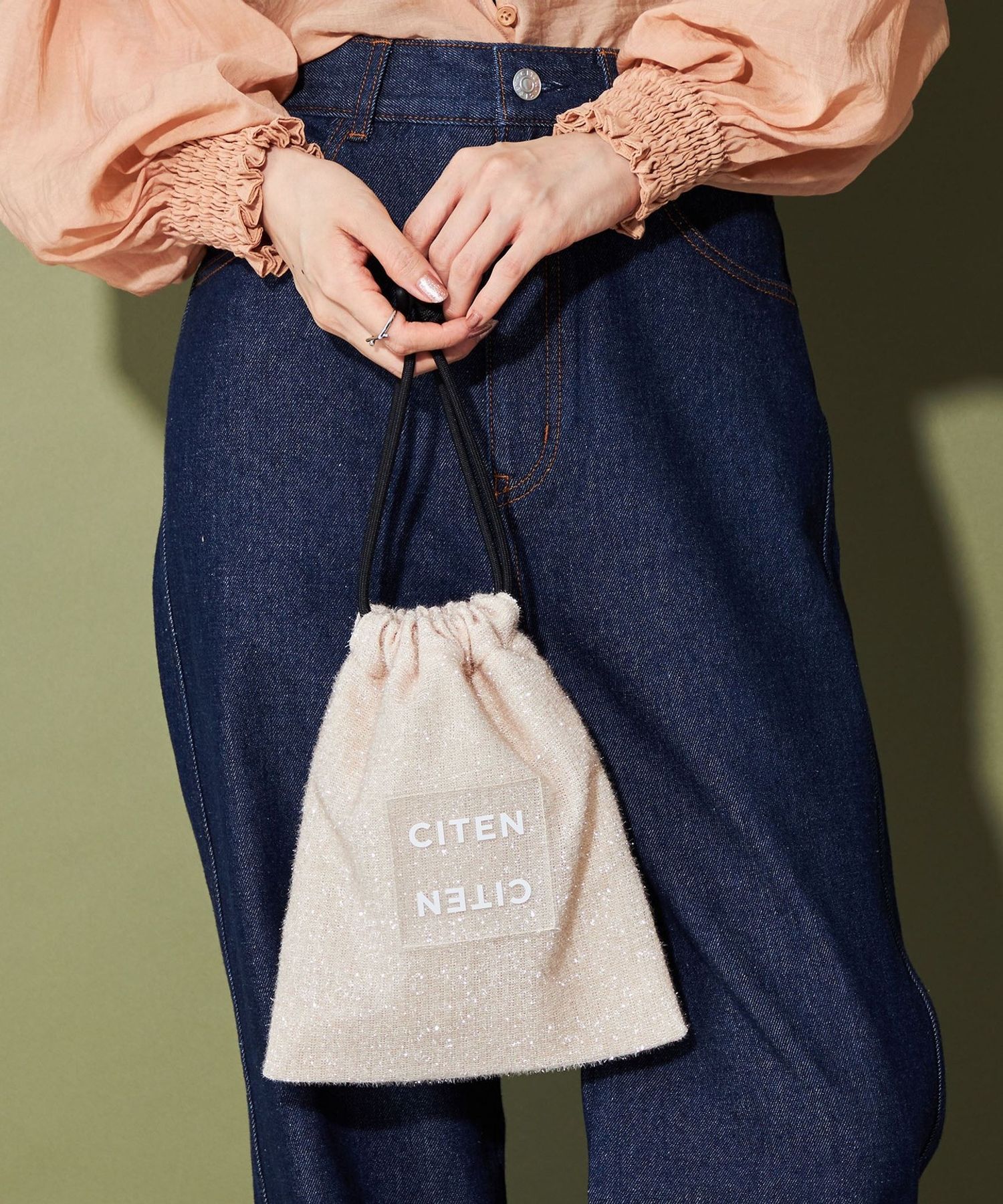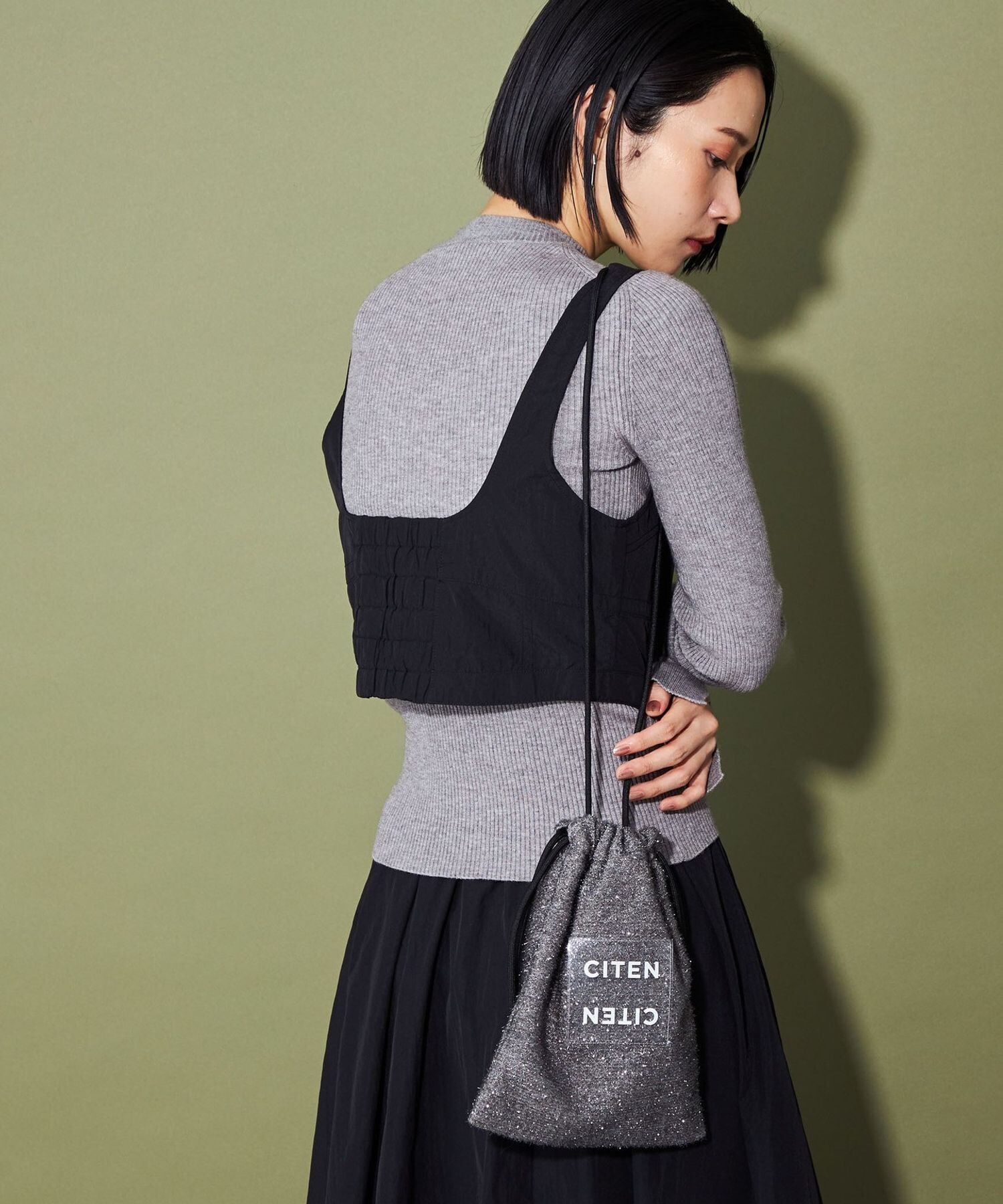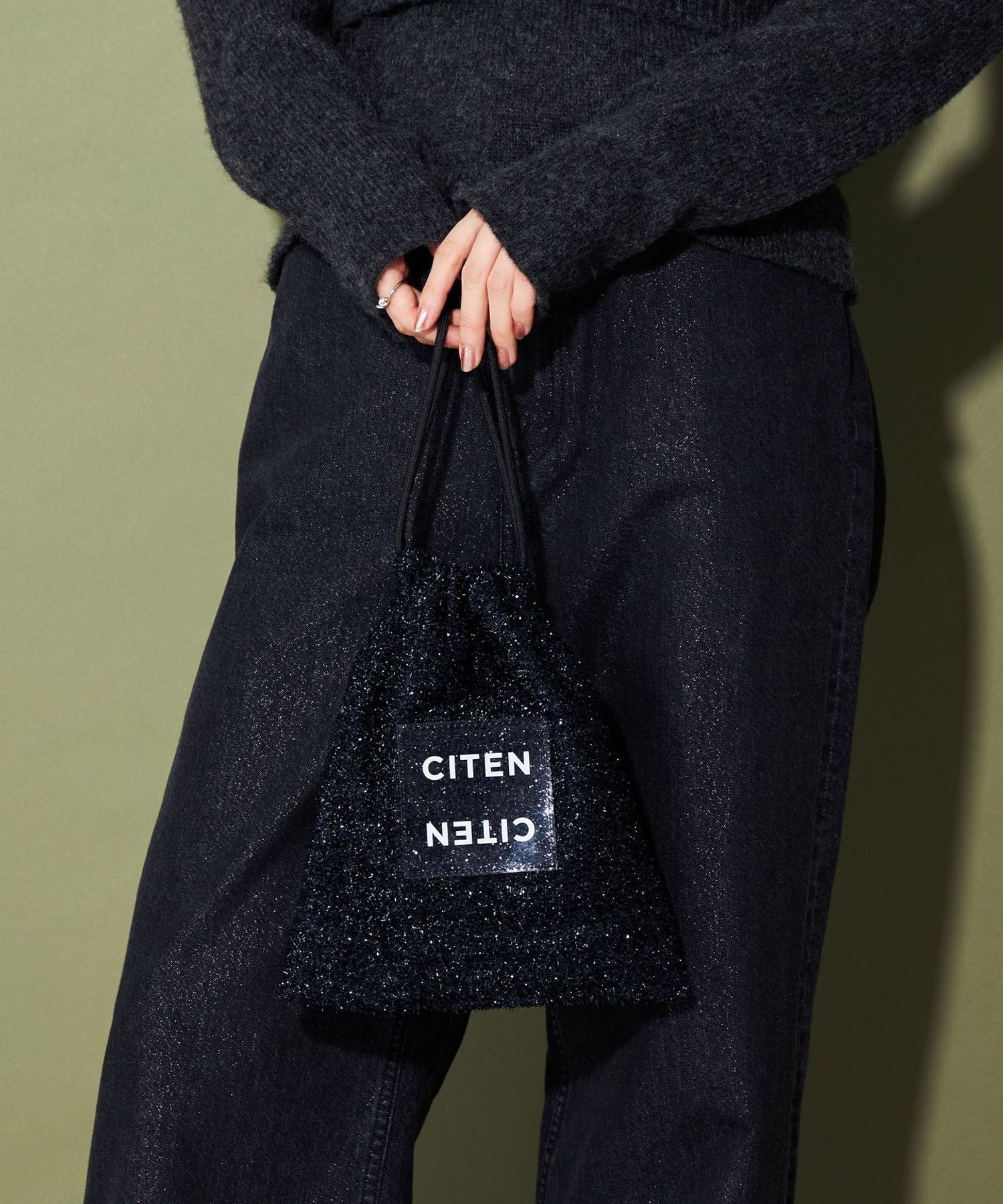 CITEN 經典的束口型肩背包,以略帶挺度的閃亮材質製作,呈現出引人注目的存在感。