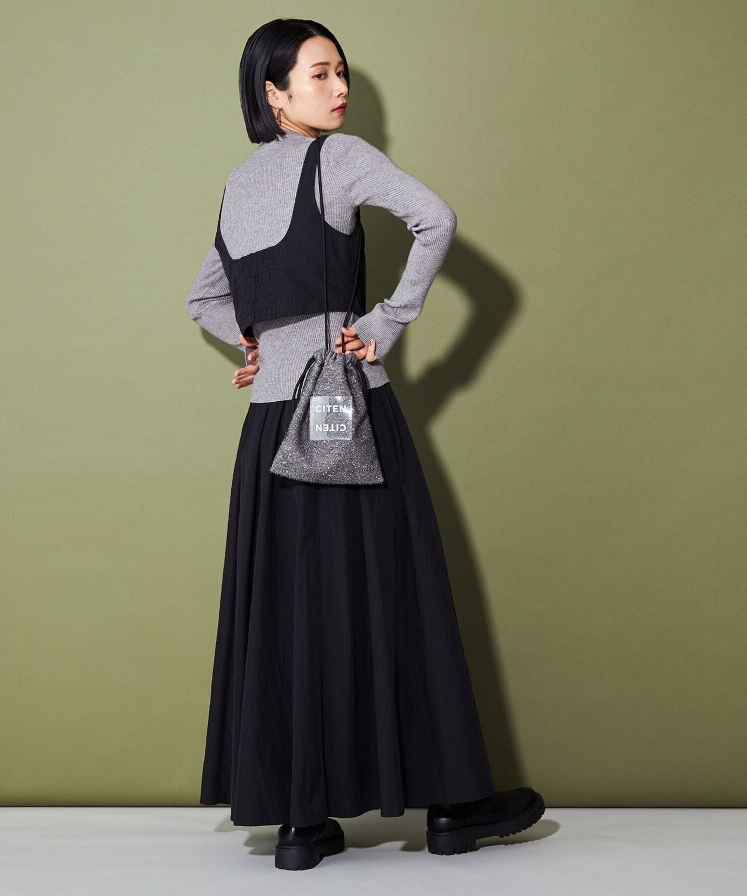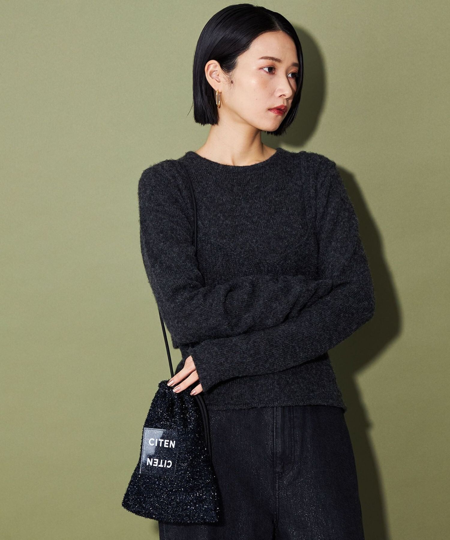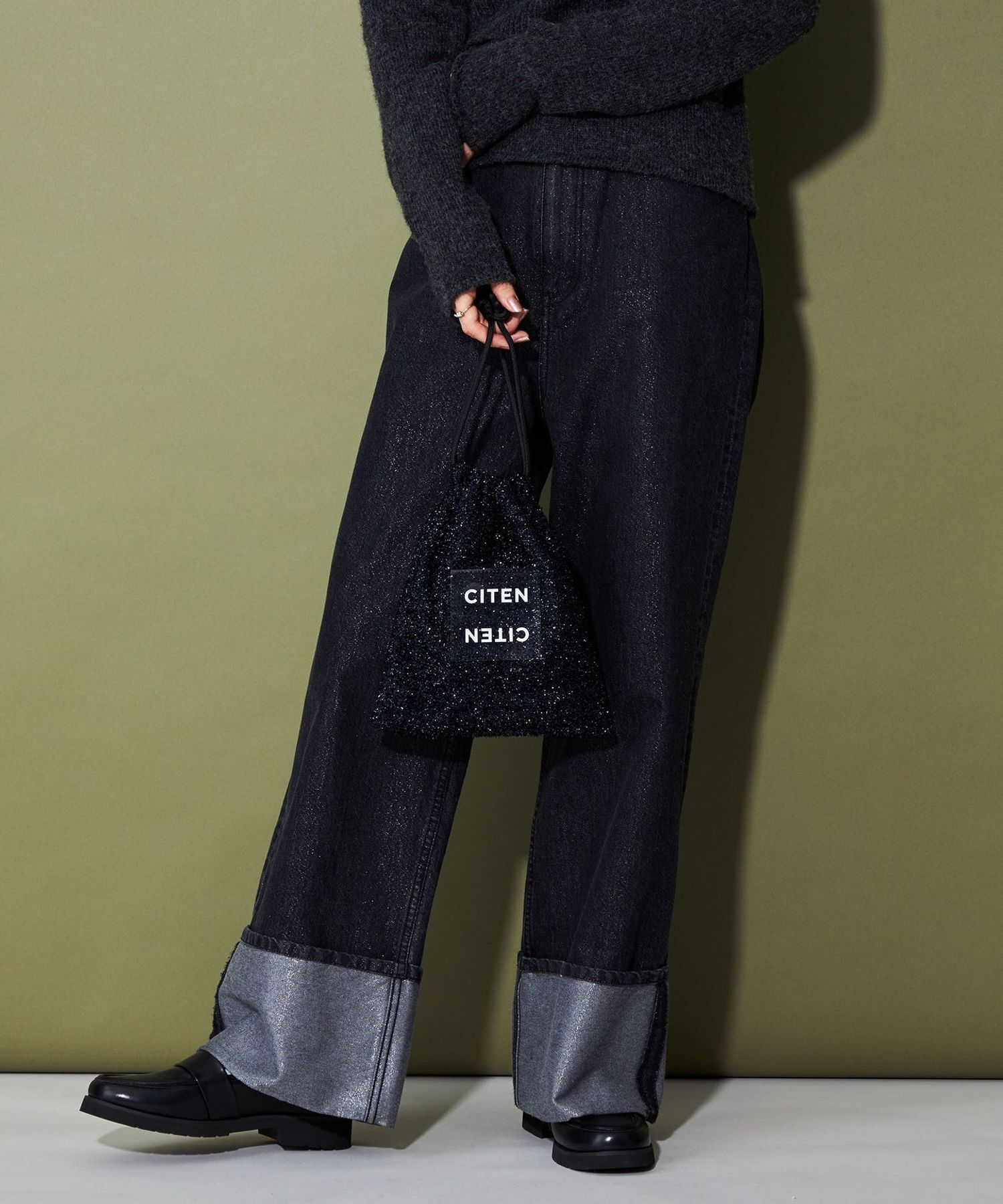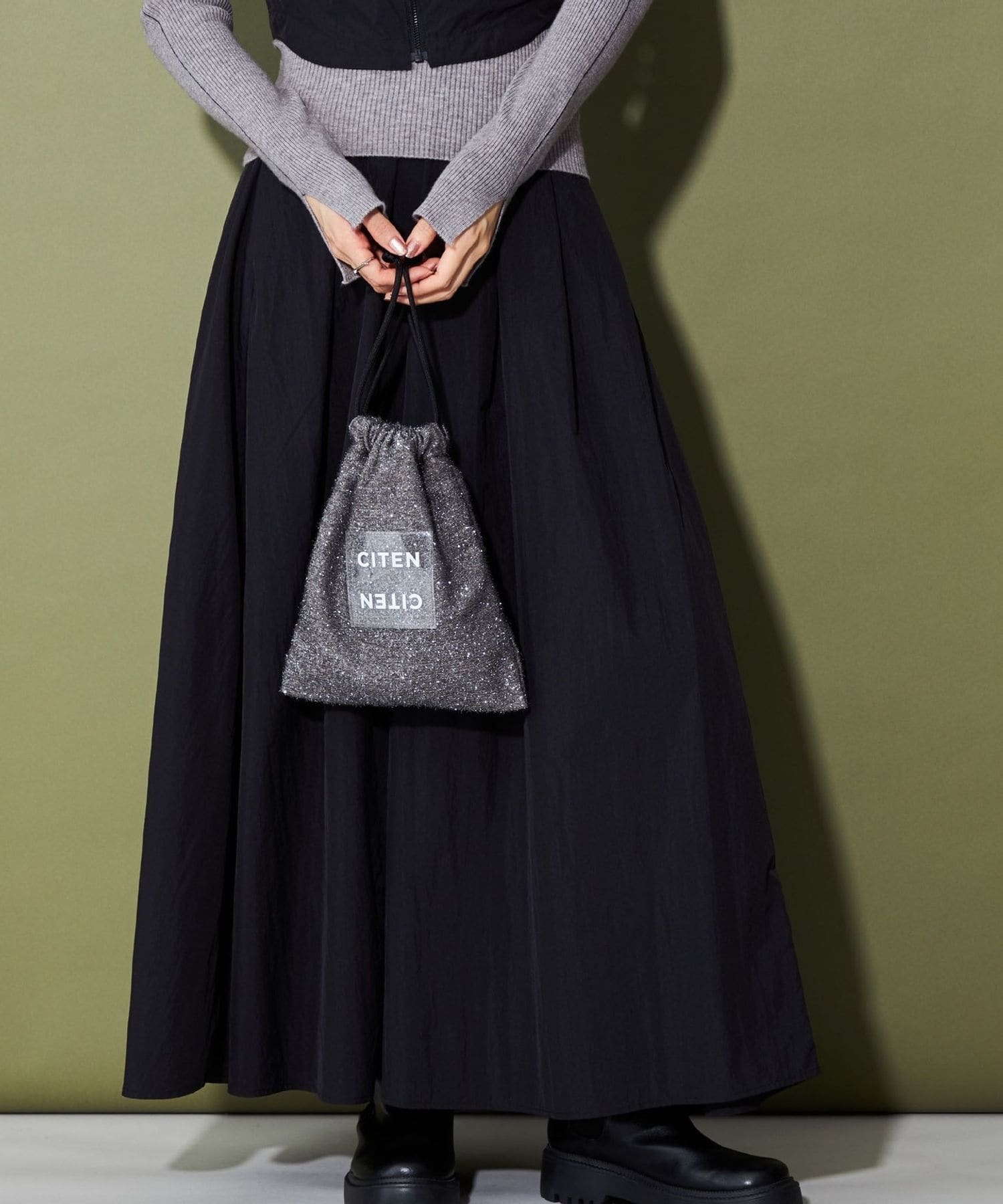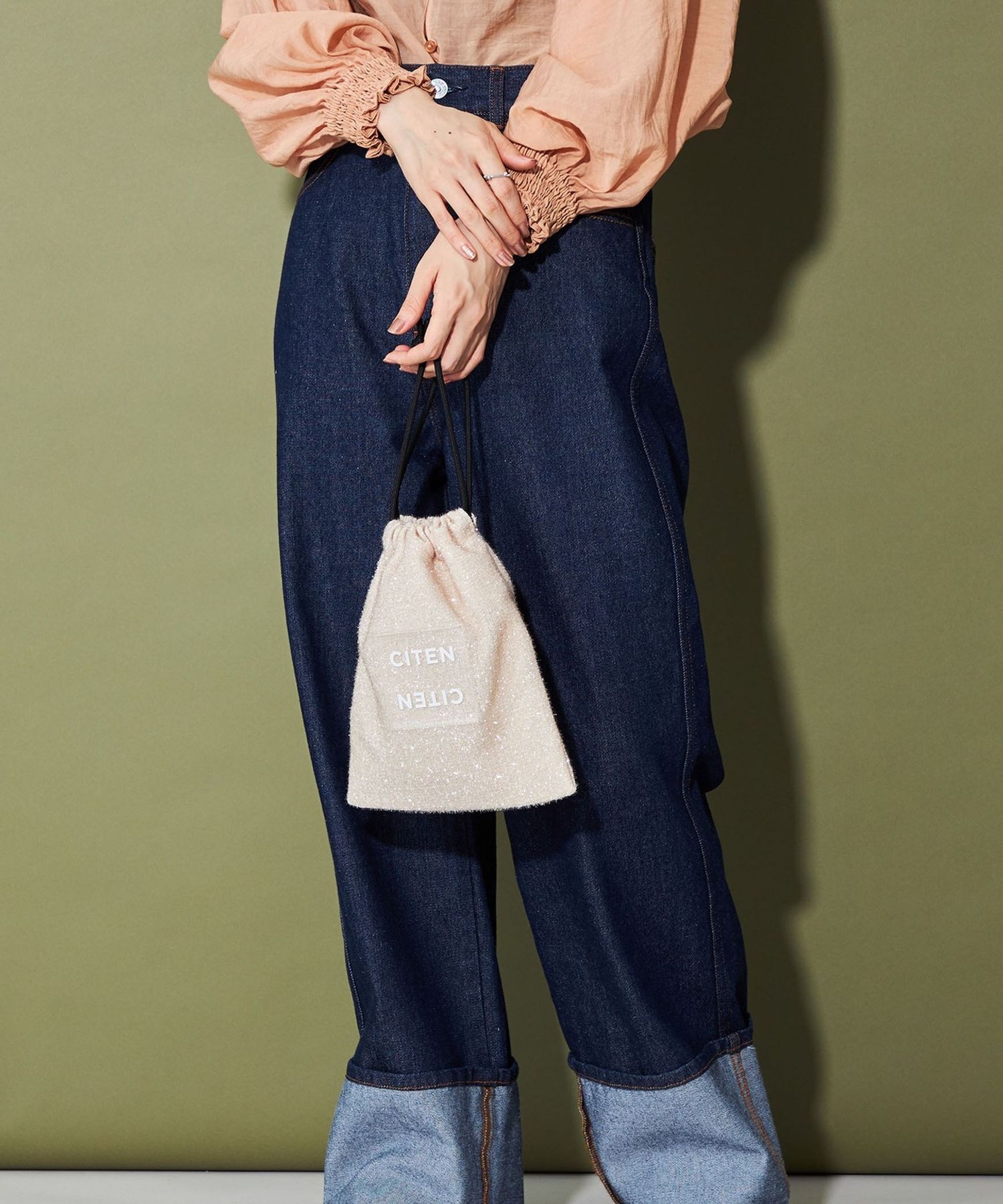 CITEN 經典的束口型肩背包,以略帶挺度的閃亮材質製作,呈現出引人注目的存在感。