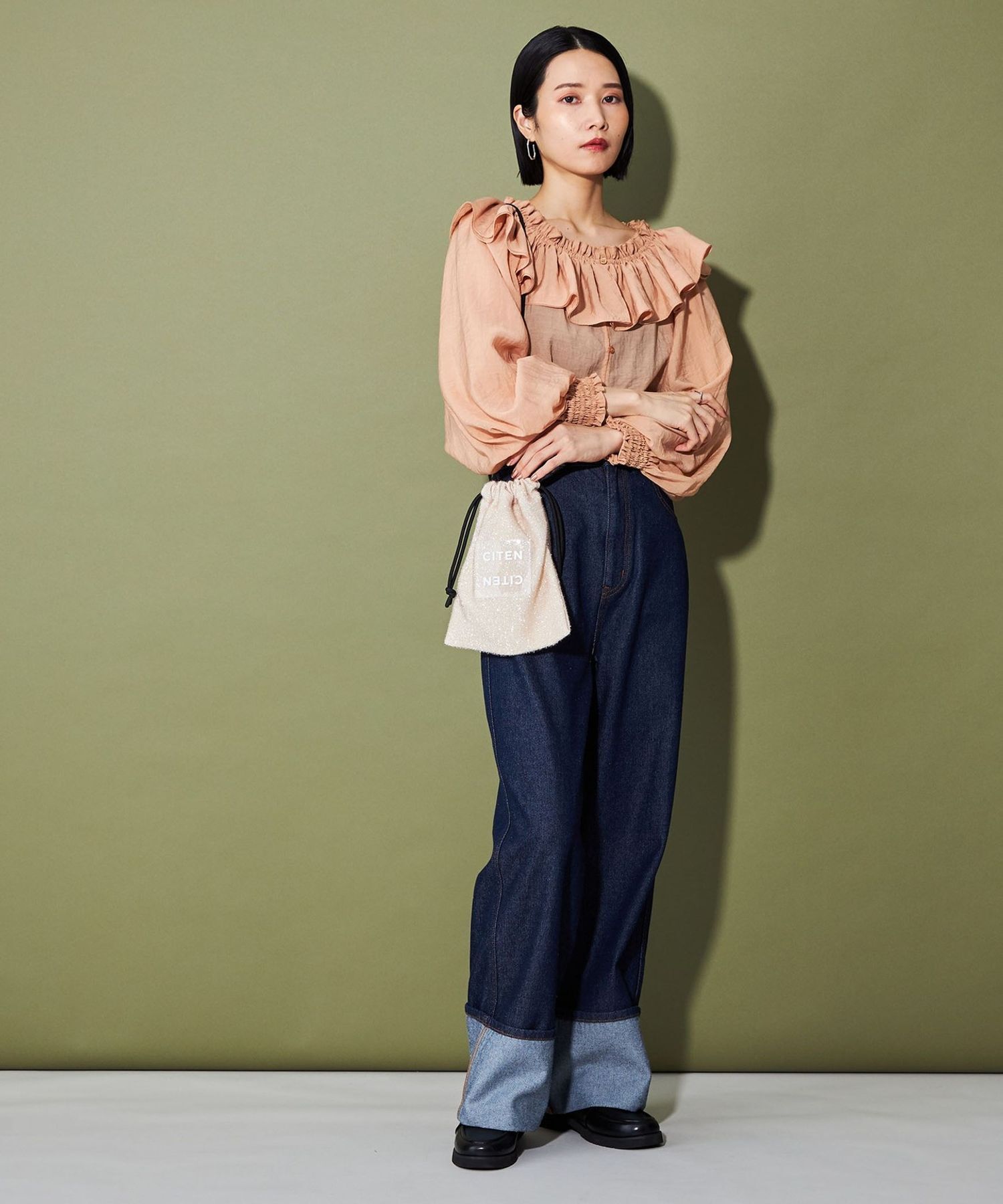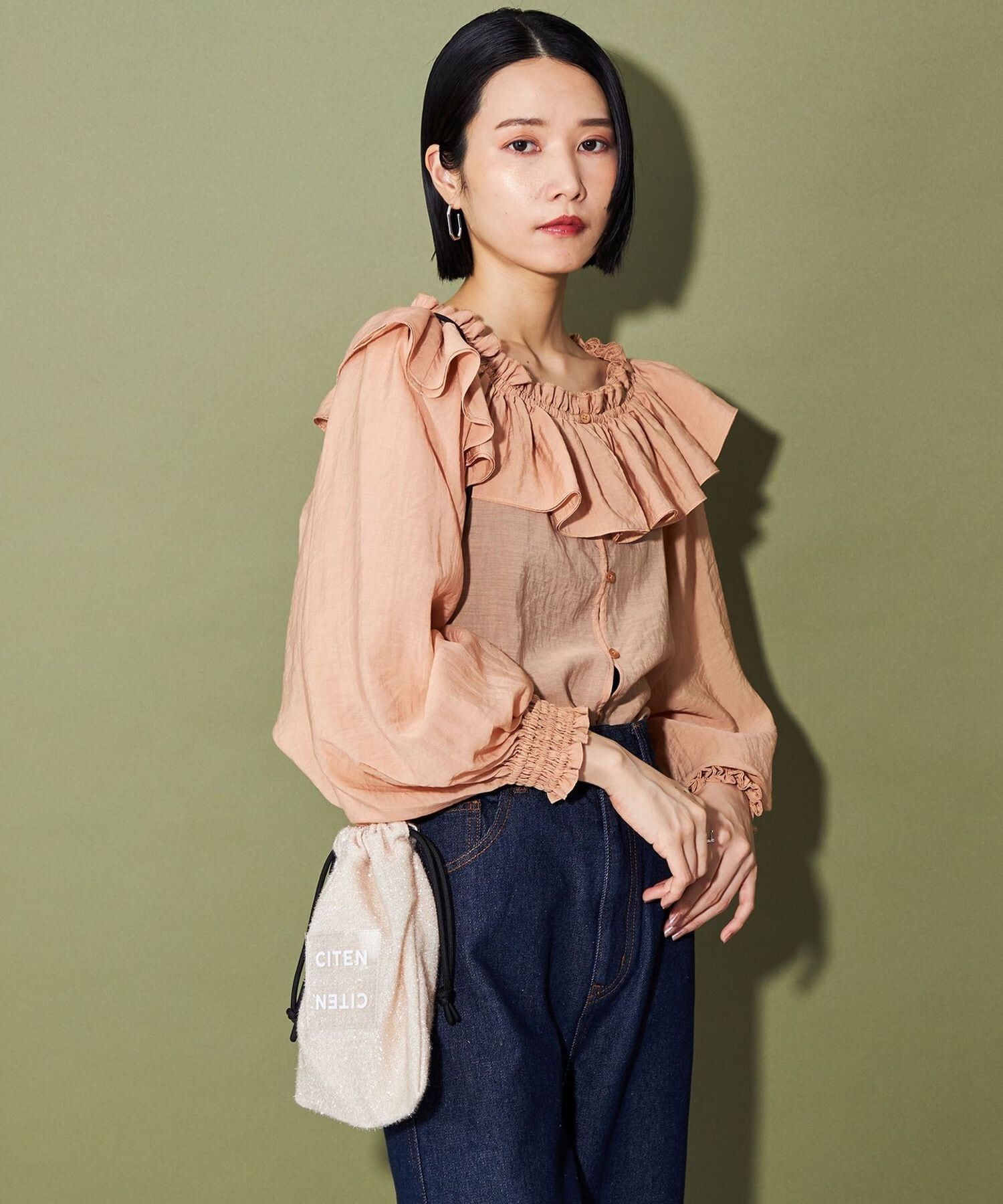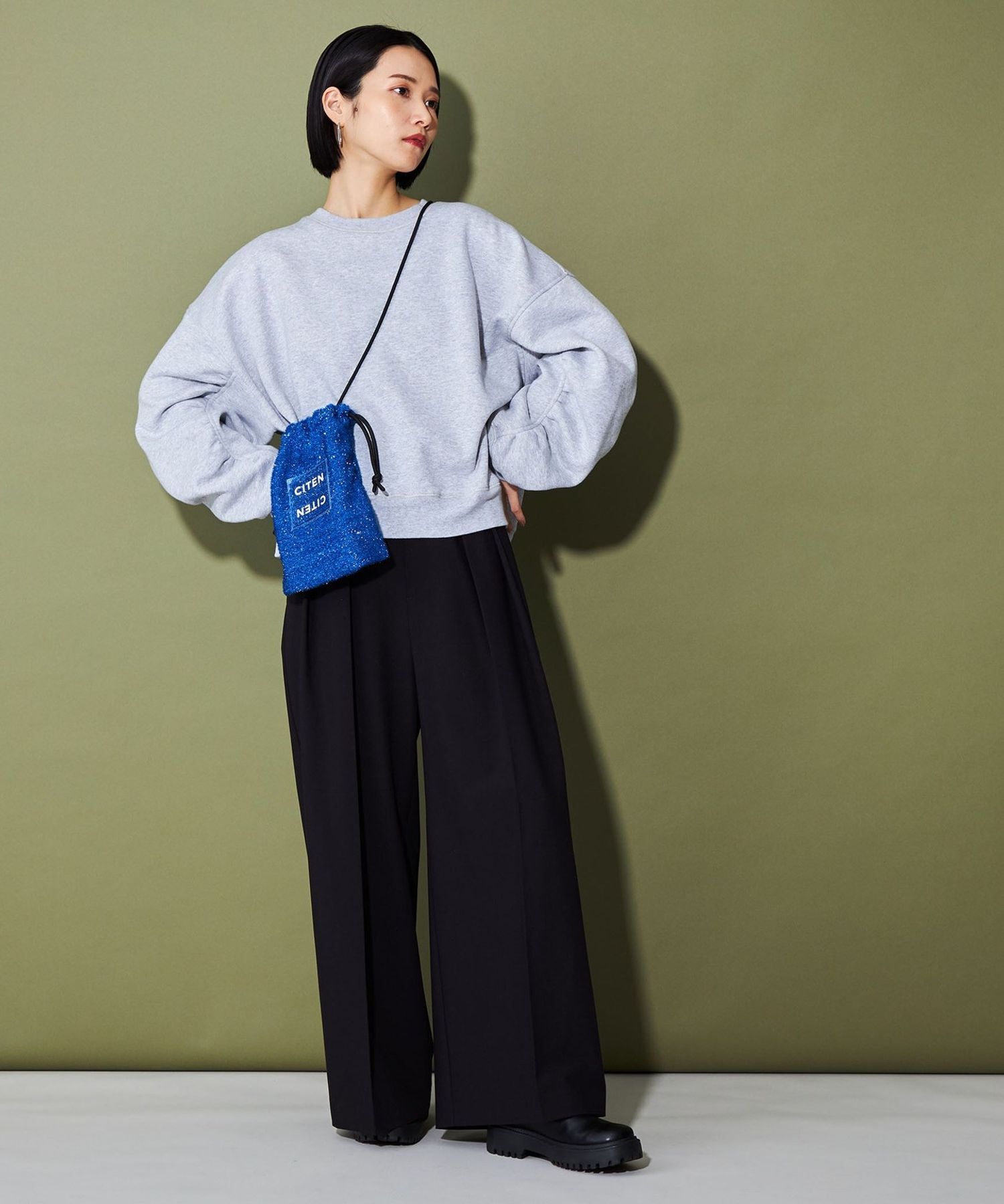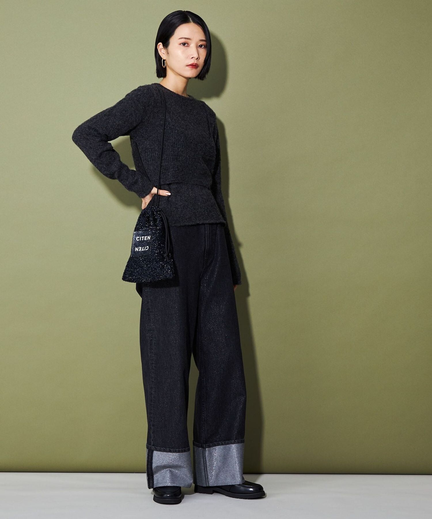 CITEN 經典的束口型肩背包,以略帶挺度的閃亮材質製作,呈現出引人注目的存在感。