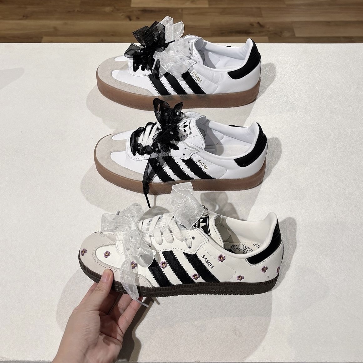 請在繫上一般鞋帶後將緞帶鞋帶當用作裝飾使用