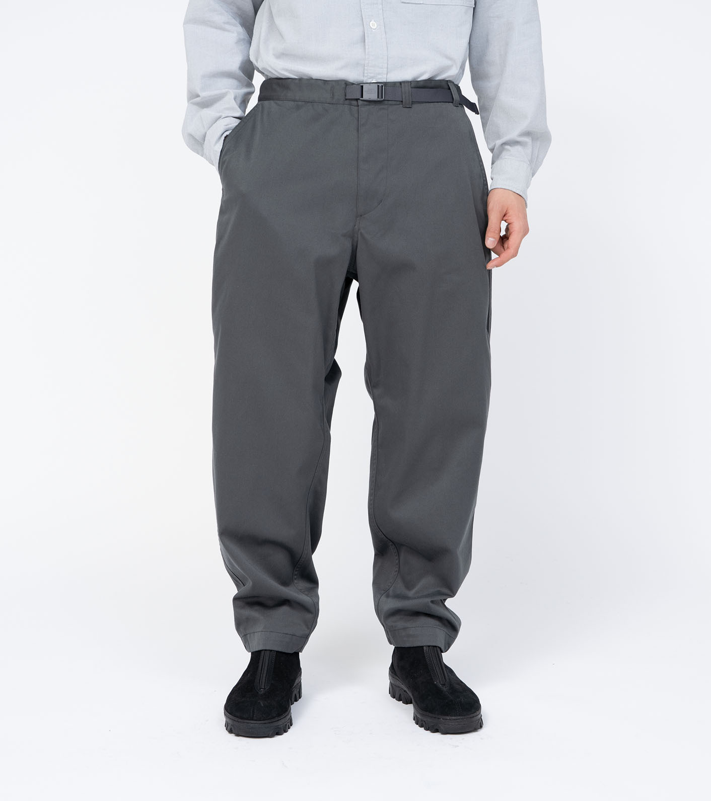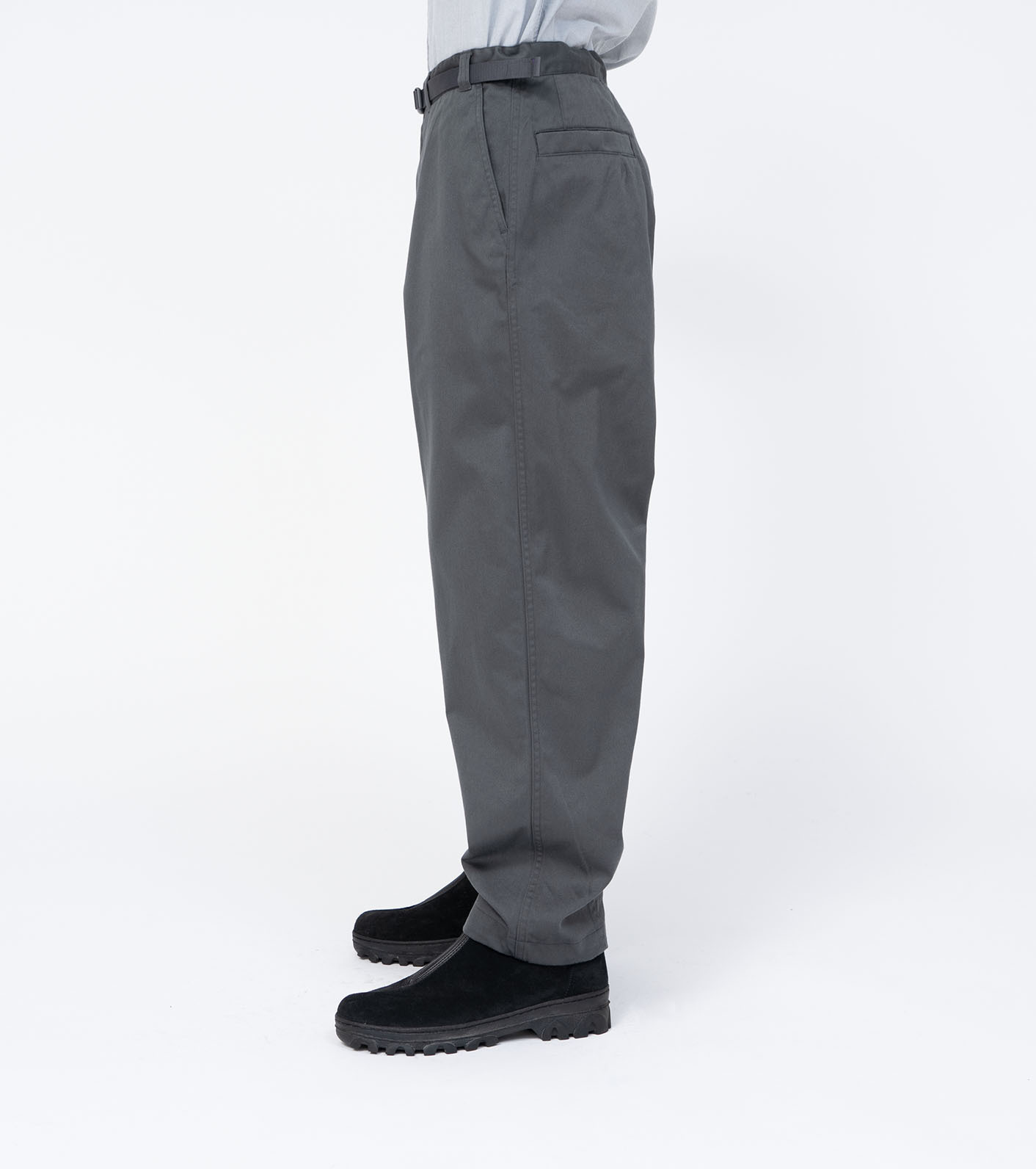臀部與大腿處寬鬆,褲腳有打摺設計(Darts),打造具有立體感的寬版錐形輪廓。
