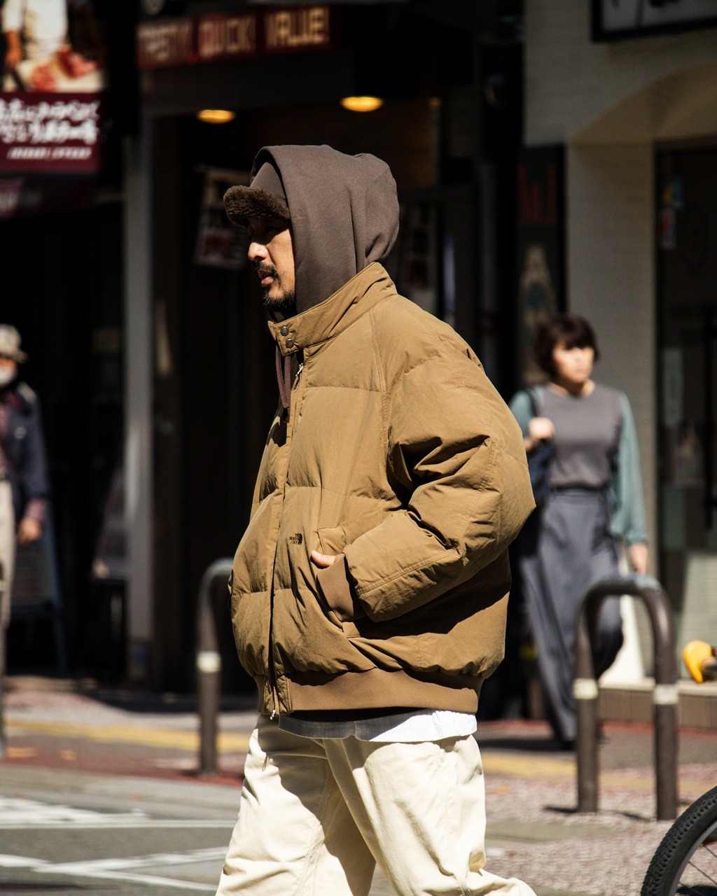 採用 再生尼龍與有機棉混紡的塔薩織布(Tussah Cloth) 製成的野外羽絨外套。