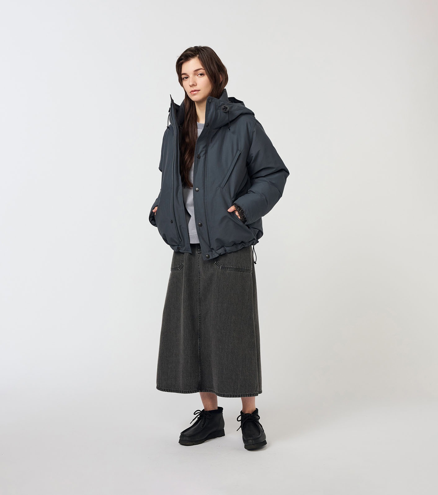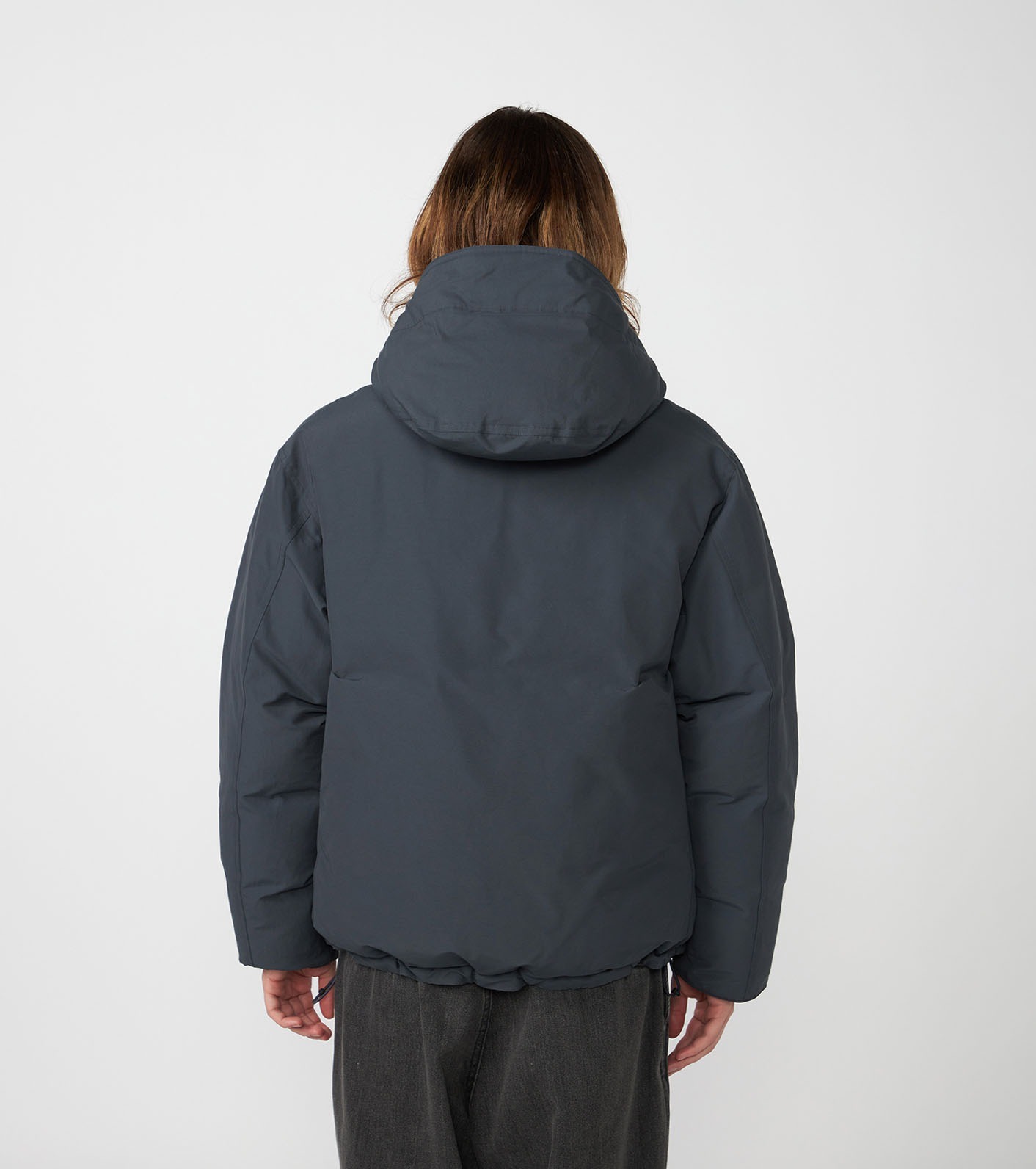 採用 有機棉與再生尼龍緞帶布(Grosgrain Cloth) 製成的短版羽絨連帽外套,經典戶外風格的定番素材。