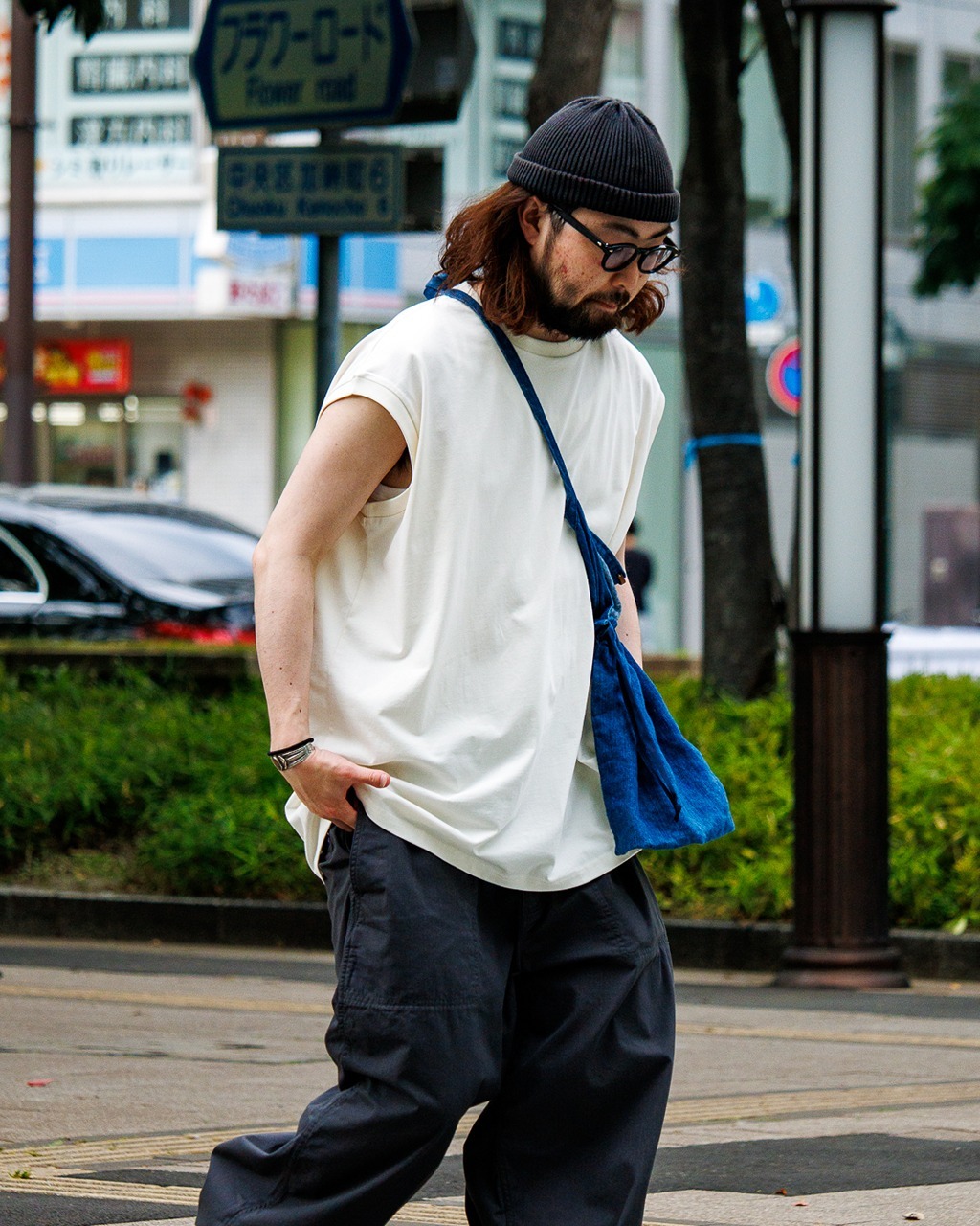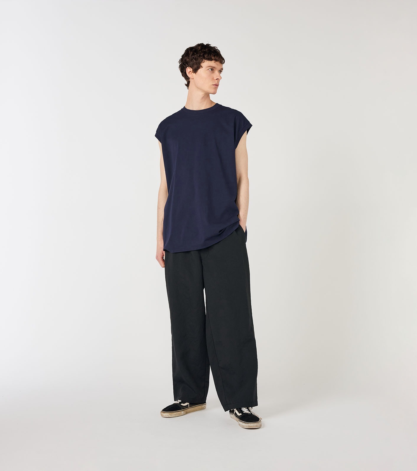 採用有機棉天竺布料製成的無袖寬版 T 恤