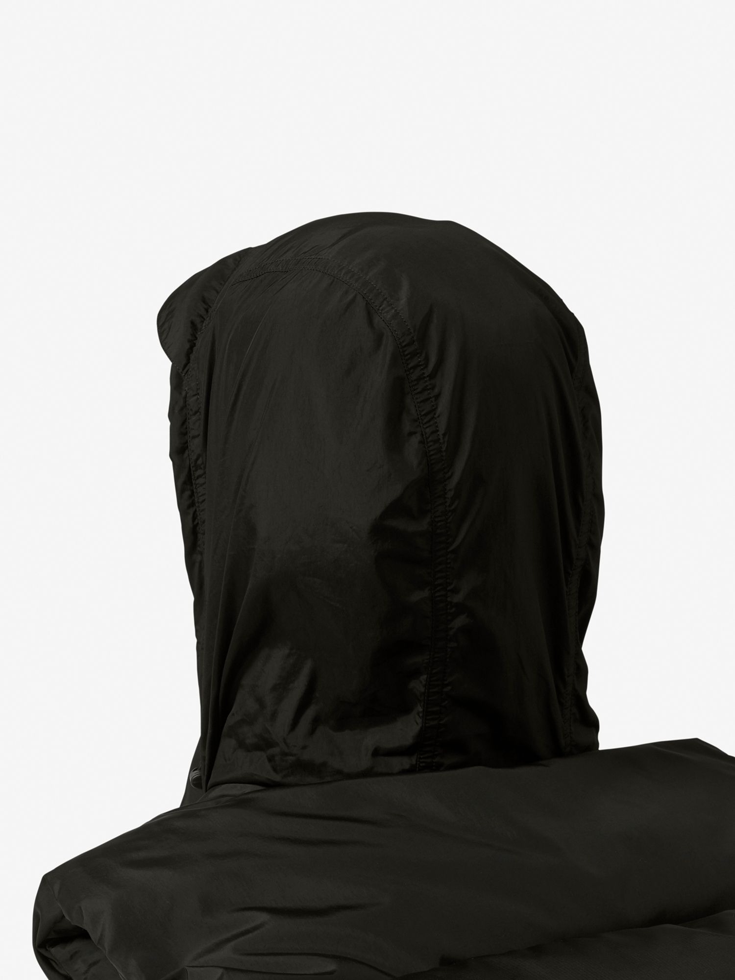部分填充物採用環保的再生羽絨,以展現對環境的重視。表布使用強度高的 40 丹尼爾防撕裂尼龍布,並施加了防潑水加工。肩部拼接部分則以厚實的尼龍布料製成,以提升耐用度。