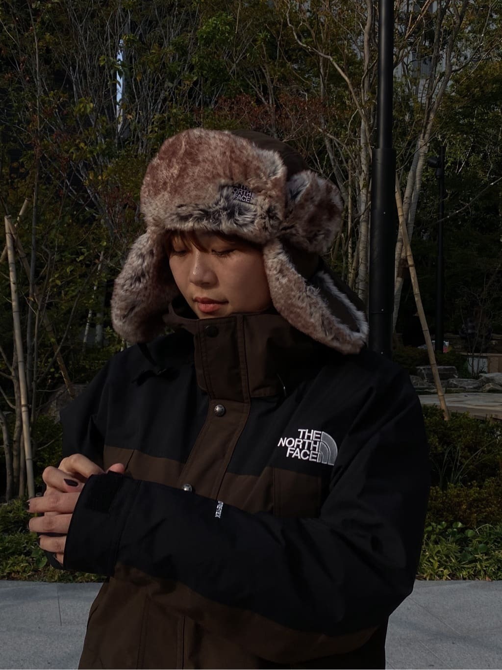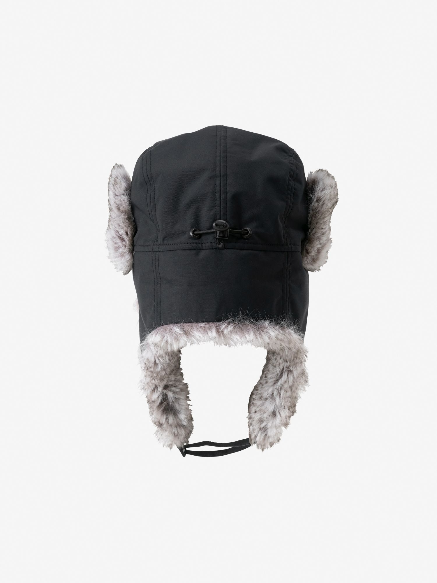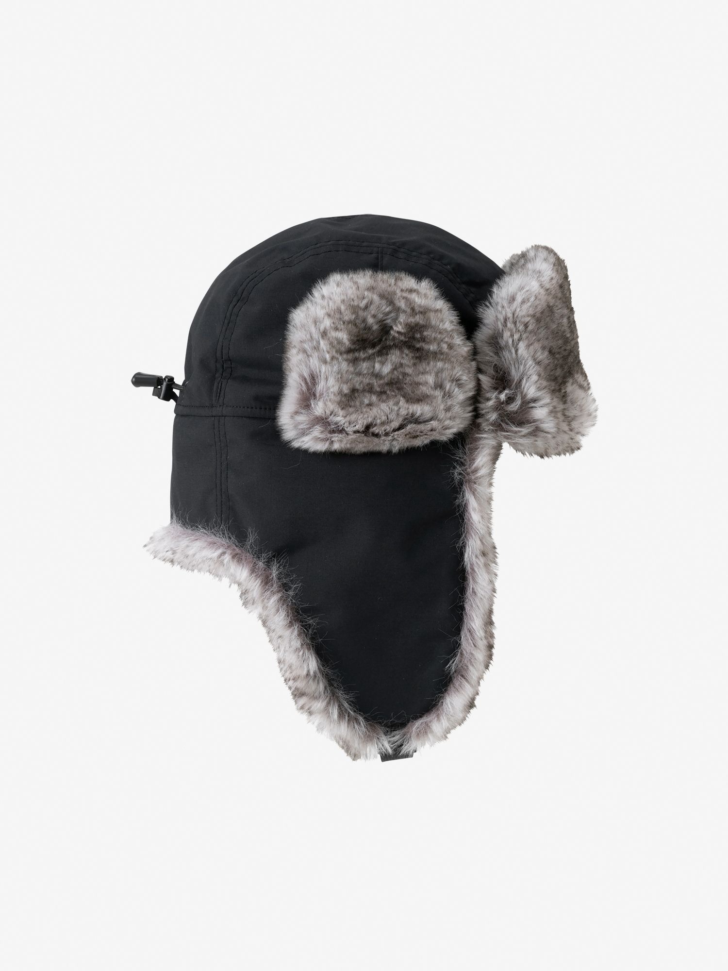 外層採用具有優秀防水透濕性的尼龍平織布料。帽簷內側與耳罩部分的聚酯纖維仿毛皮,色澤與觸感宛如真毛。毛長厚實,可蓄積靜止空氣以提高保暖性。縫線經過壓膠防水處理。耳罩可利用織帶扣環固定於頭頂。附有 UV 防護(UPF50+,紫外線阻隔率 95%以上)。