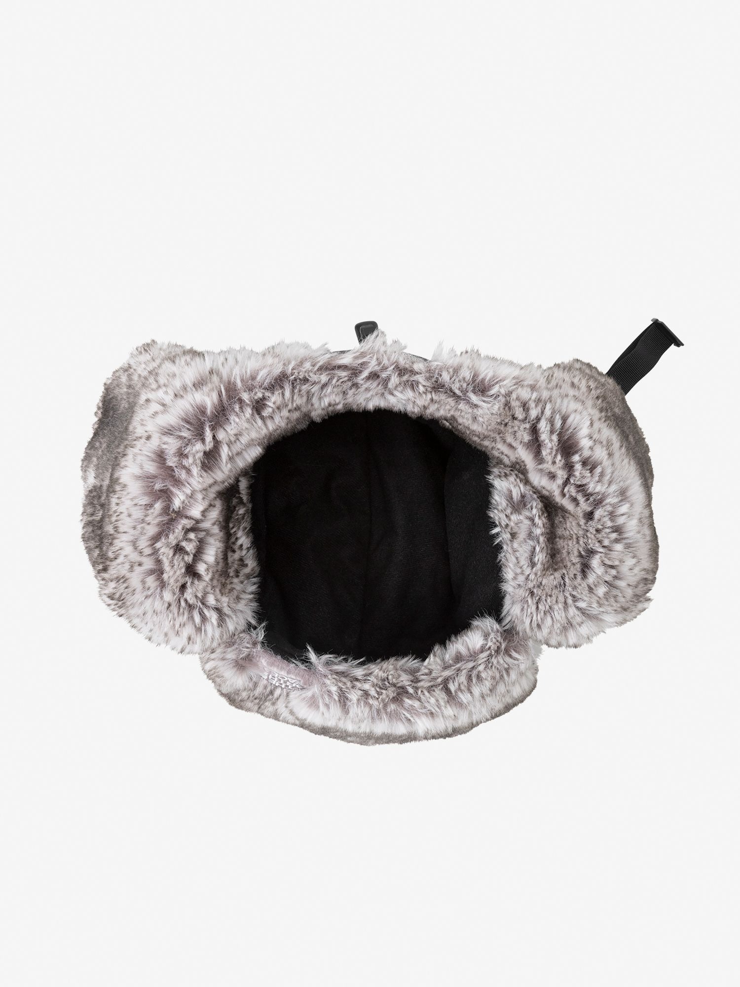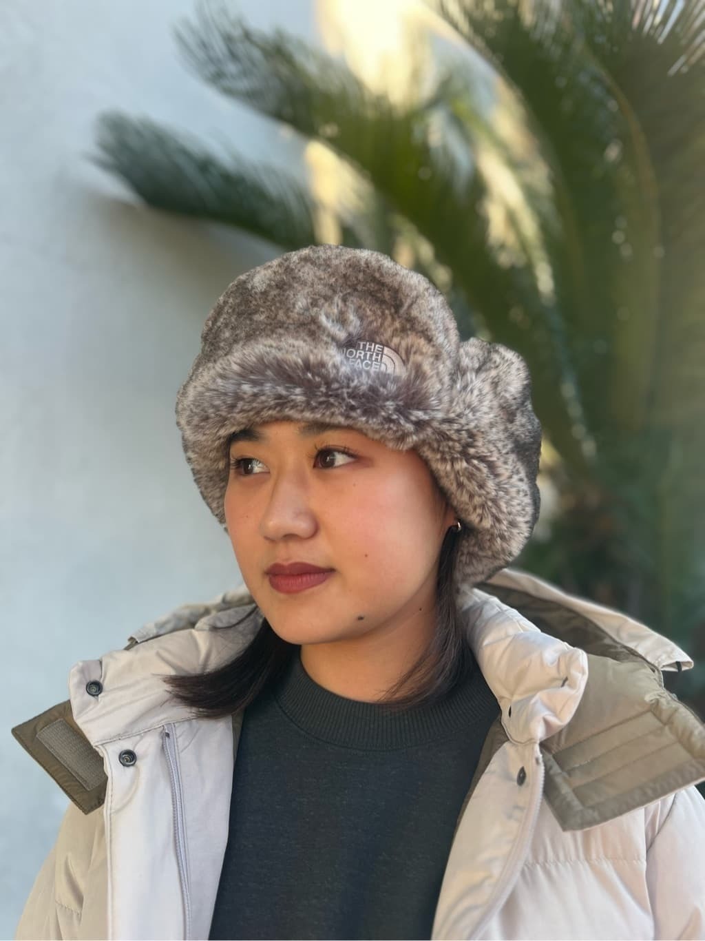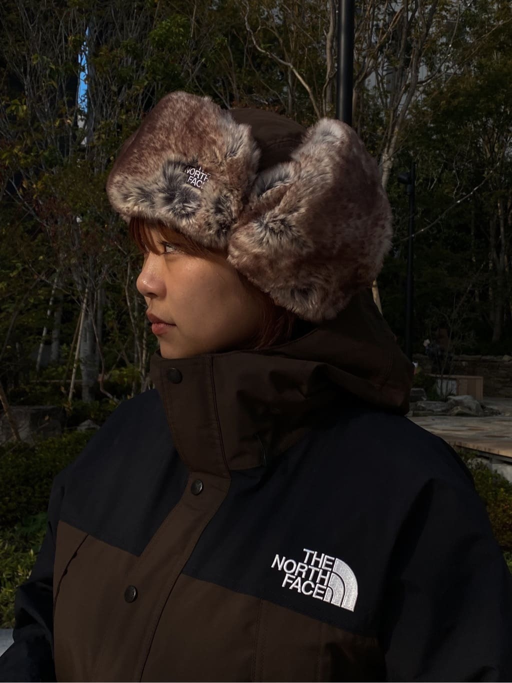 外層採用具有優秀防水透濕性的尼龍平織布料。帽簷內側與耳罩部分的聚酯纖維仿毛皮,色澤與觸感宛如真毛。毛長厚實,可蓄積靜止空氣以提高保暖性。縫線經過壓膠防水處理。耳罩可利用織帶扣環固定於頭頂。附有 UV 防護(UPF50+,紫外線阻隔率 95%以上)。