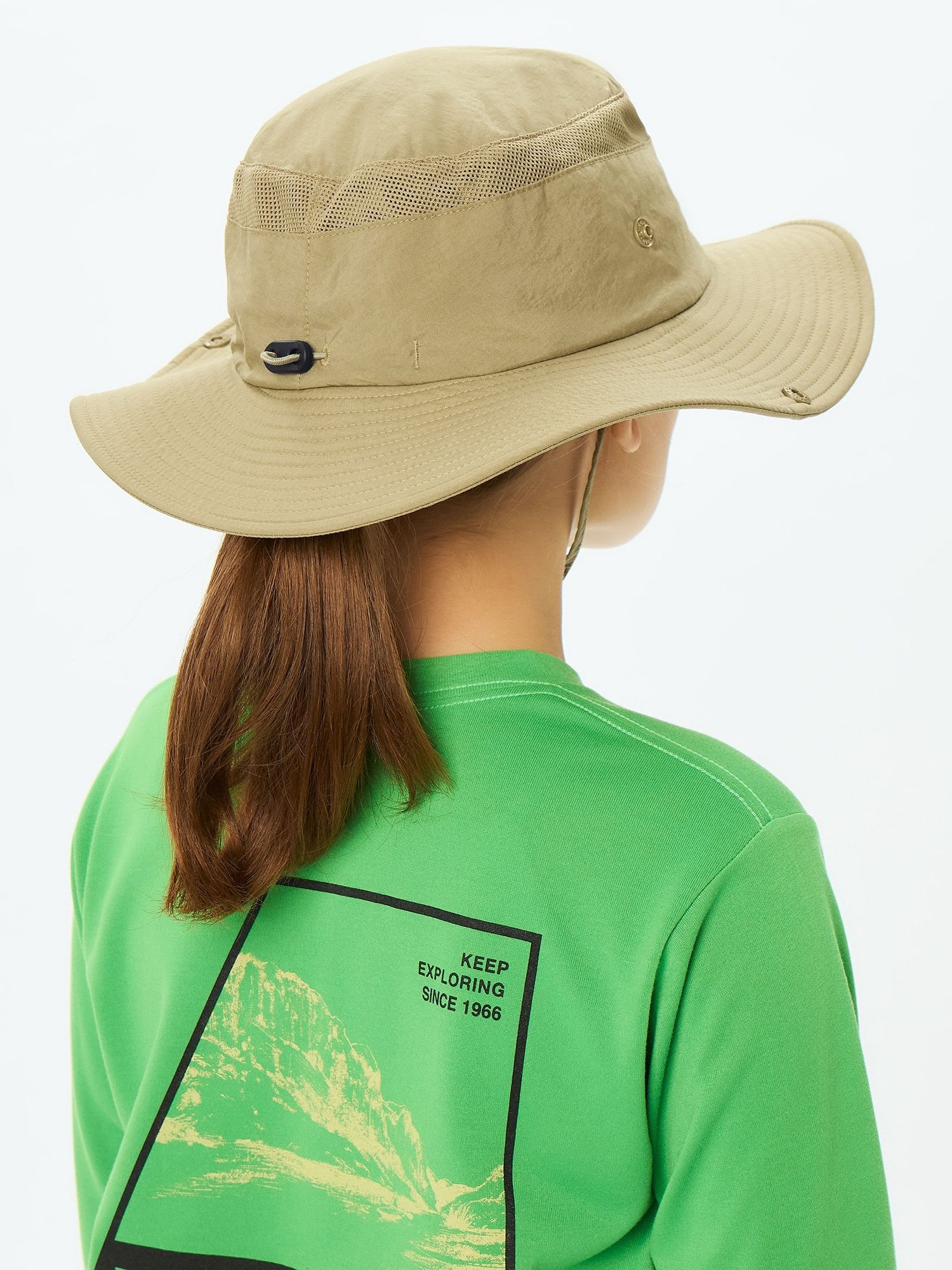 帽體採用輕量的防潑水尼龍材質,並在頭部與防曬披肩部分加上透氣網布,有效排出悶熱感,讓孩子戴得更舒適。